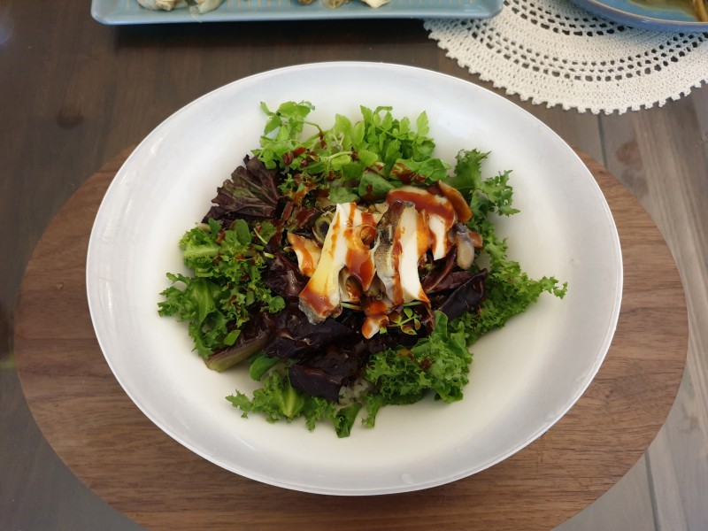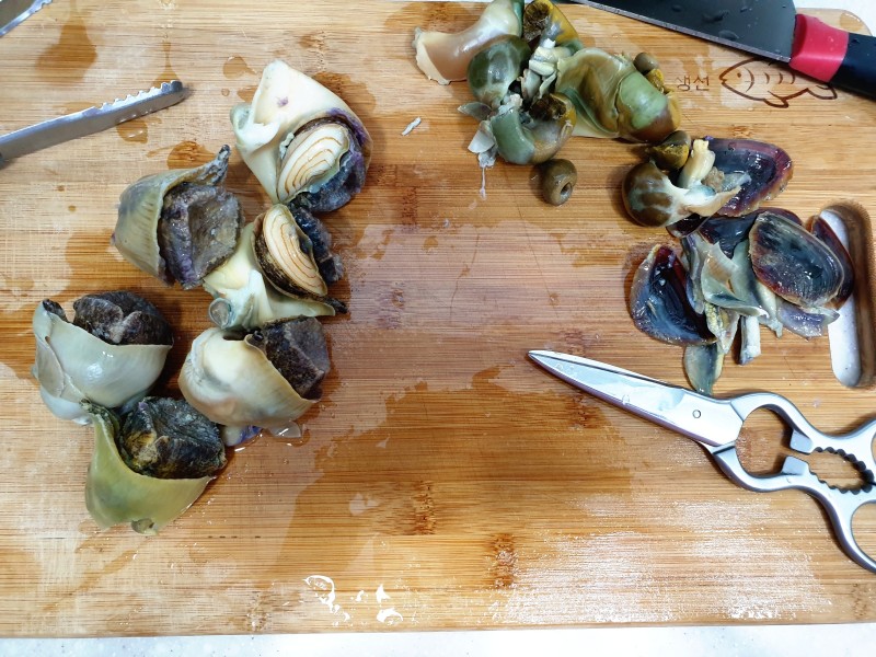 뚜껑이랑 내장, 침샘 제거하고 얇게 썰었어요.