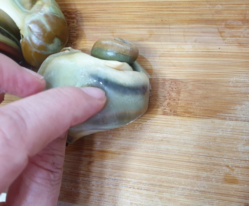 삶아낸 소라는 빼서 뚜껑을 떼면서 뻘이 있는지 자세히 살펴보세요.