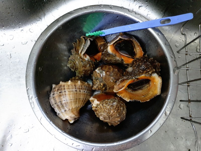 소라를 찔 때는 깨끗이 씻은 소라를 냄비에 넣고 소라가 잠길정도의 물을 부어주세요.