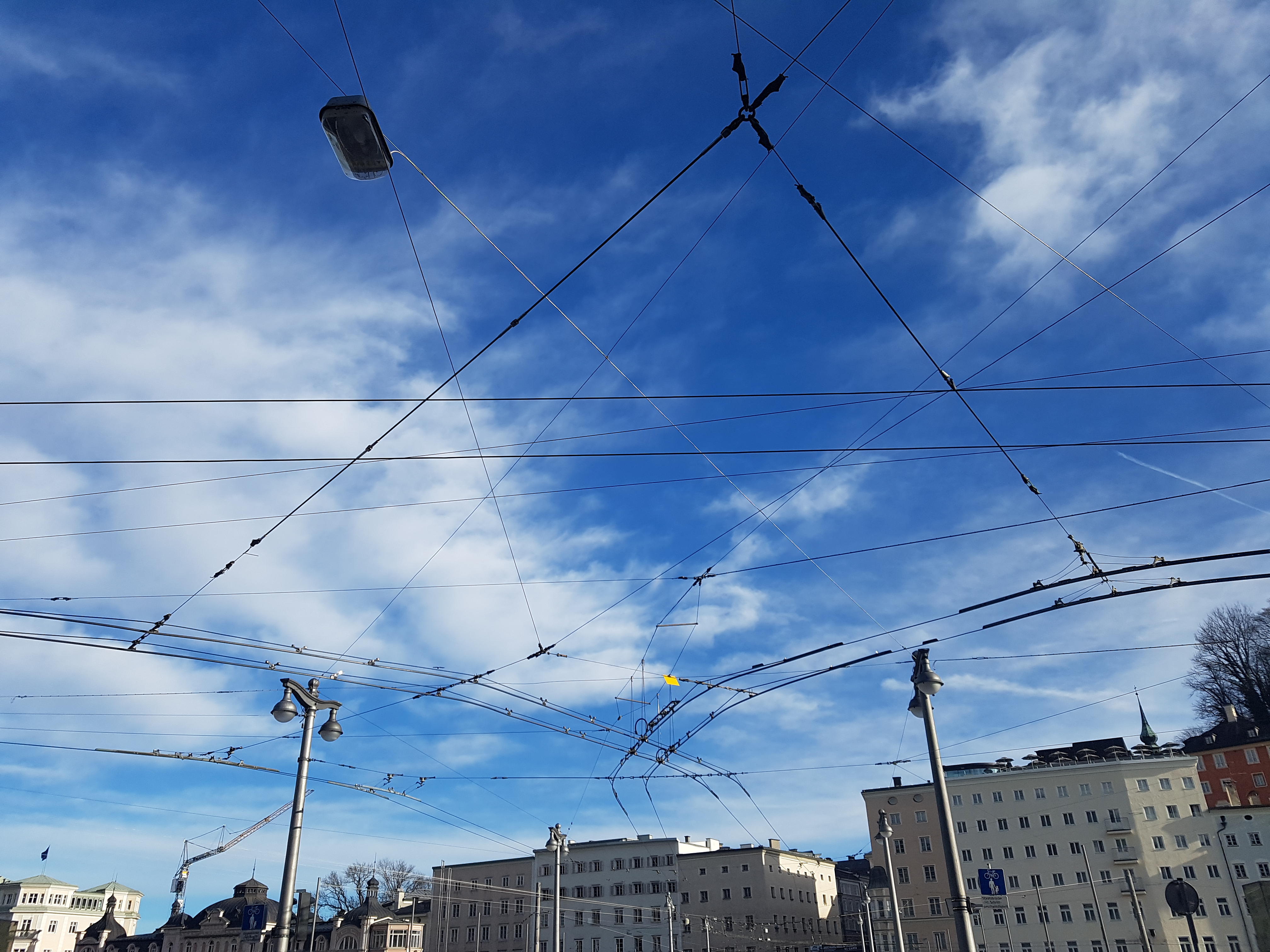 하늘에 거미줄처럼 있는 선들이 트램을 안내하는 길들이다.