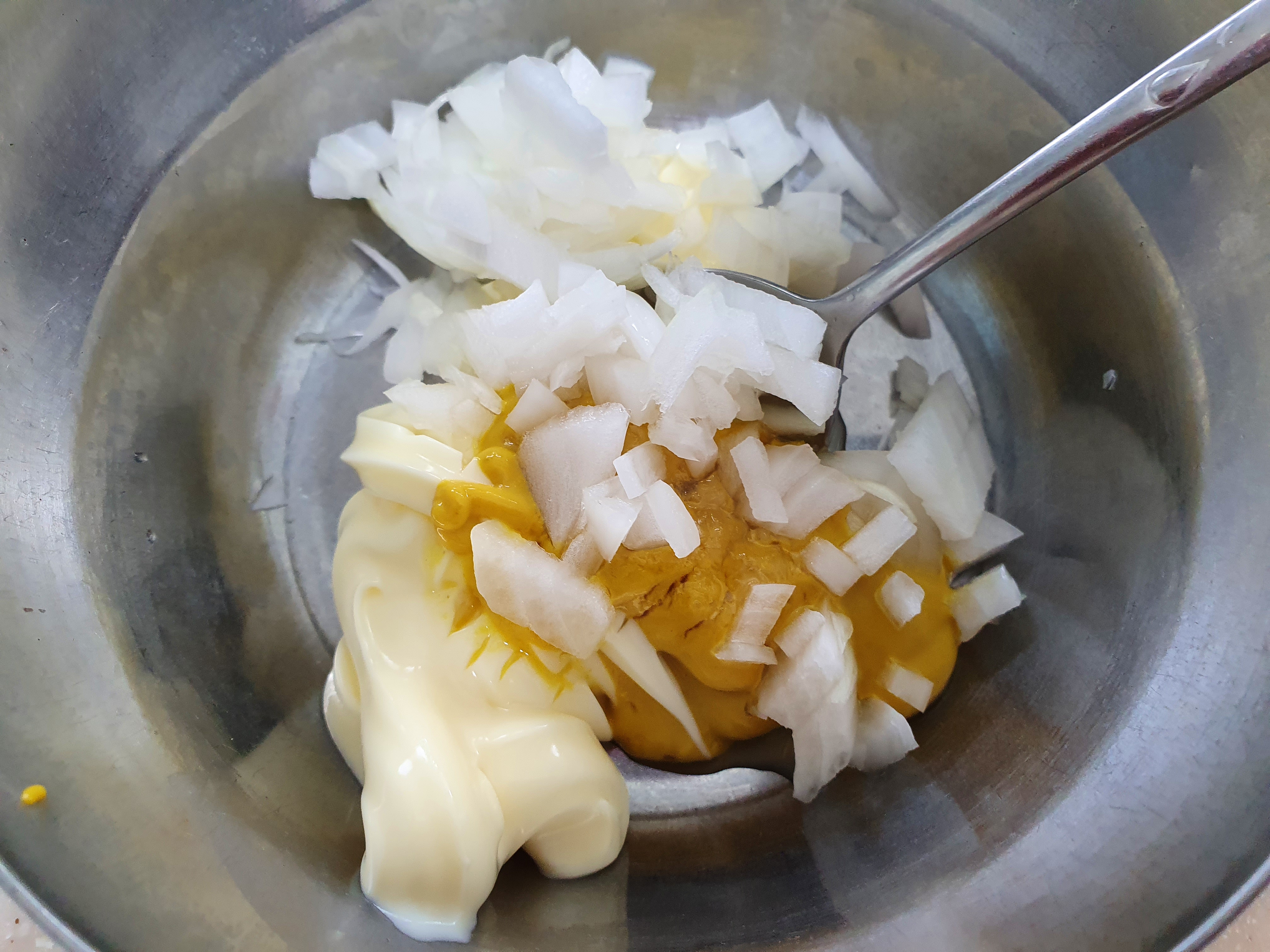 마요네즈에 머스타드를 1 : 1로 섞고, 양파를 다져 넣었습니다.