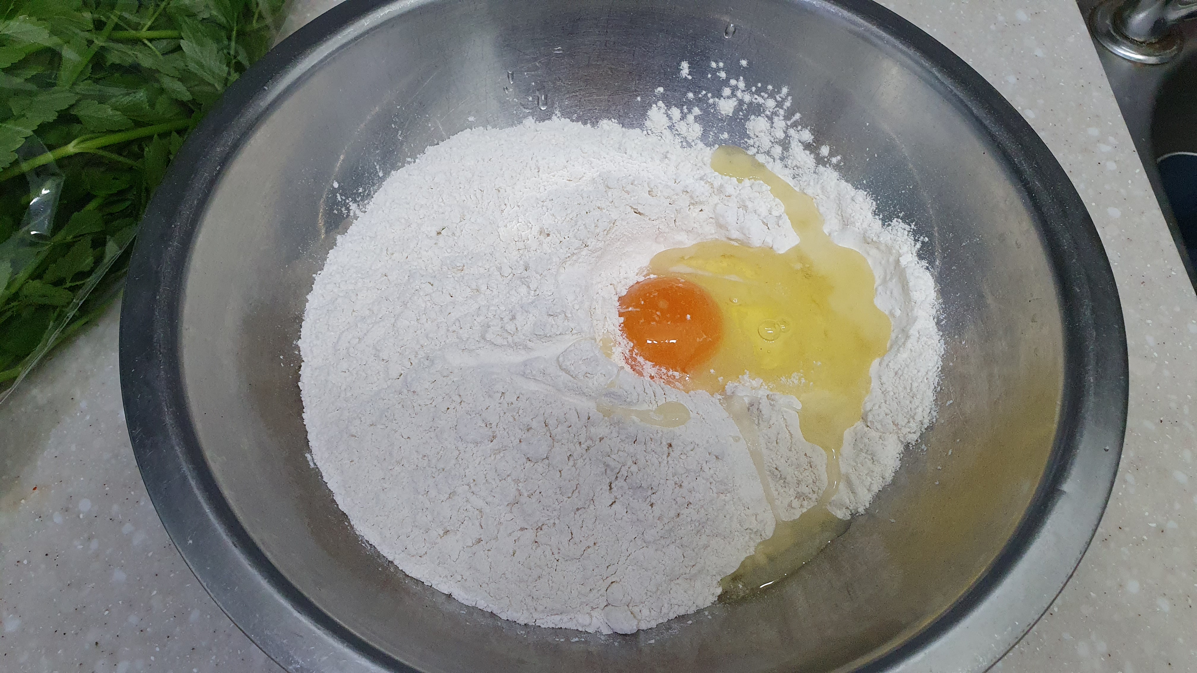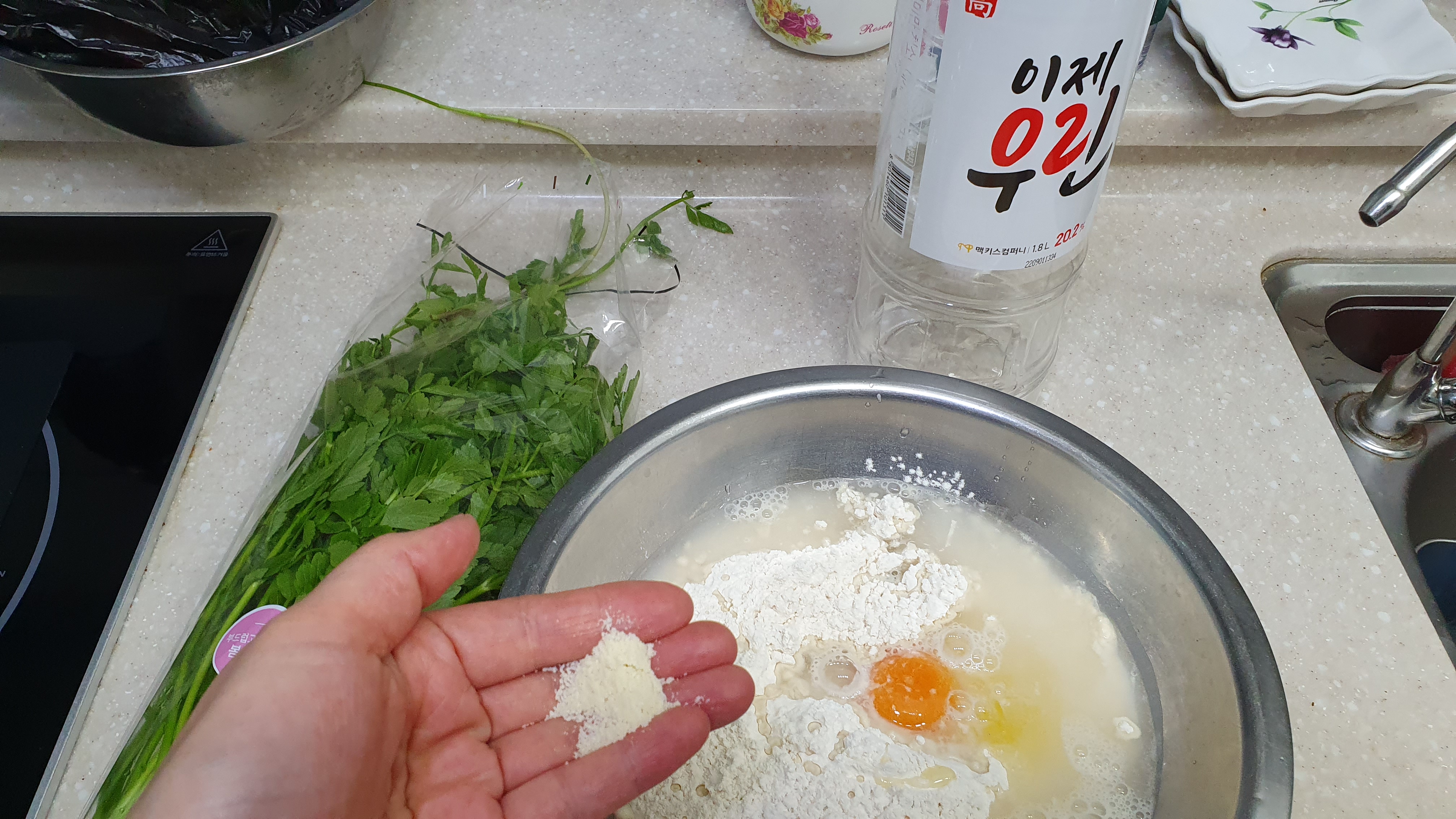 부침개 반죽에 달걀을 안 풀기도 하지만 저는 영양을 위해서 항상 달걀을 한두개씩 넣어줍니다.