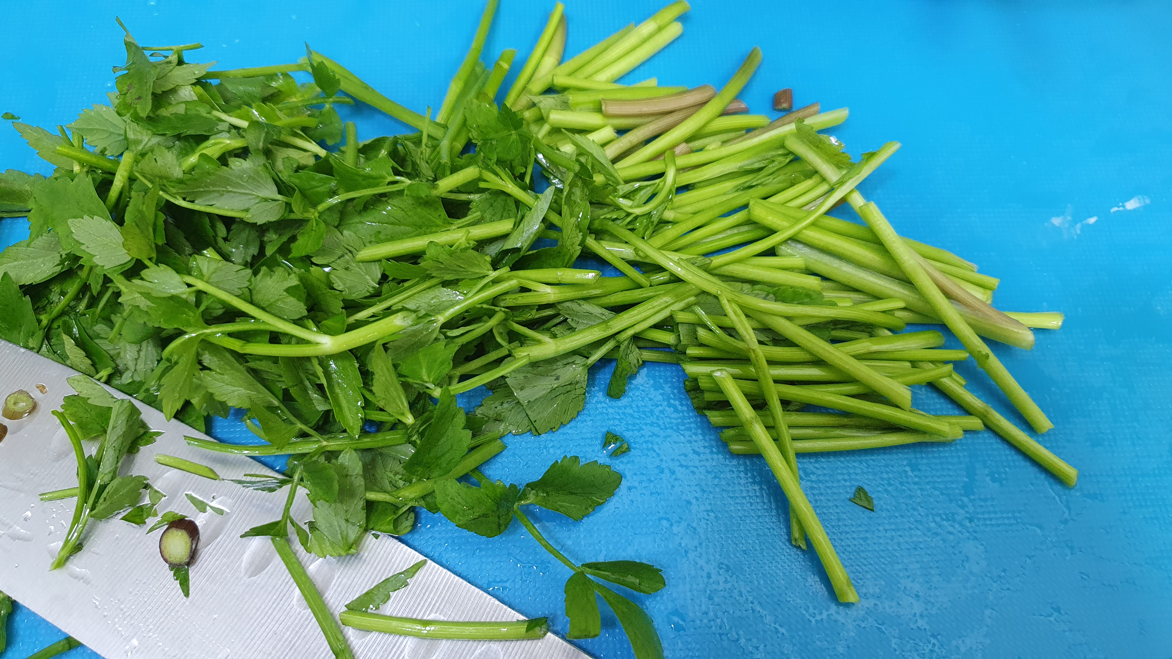 깨끗이 씻은 미나리의 굵은 줄기는 잘게 썰어주세요.