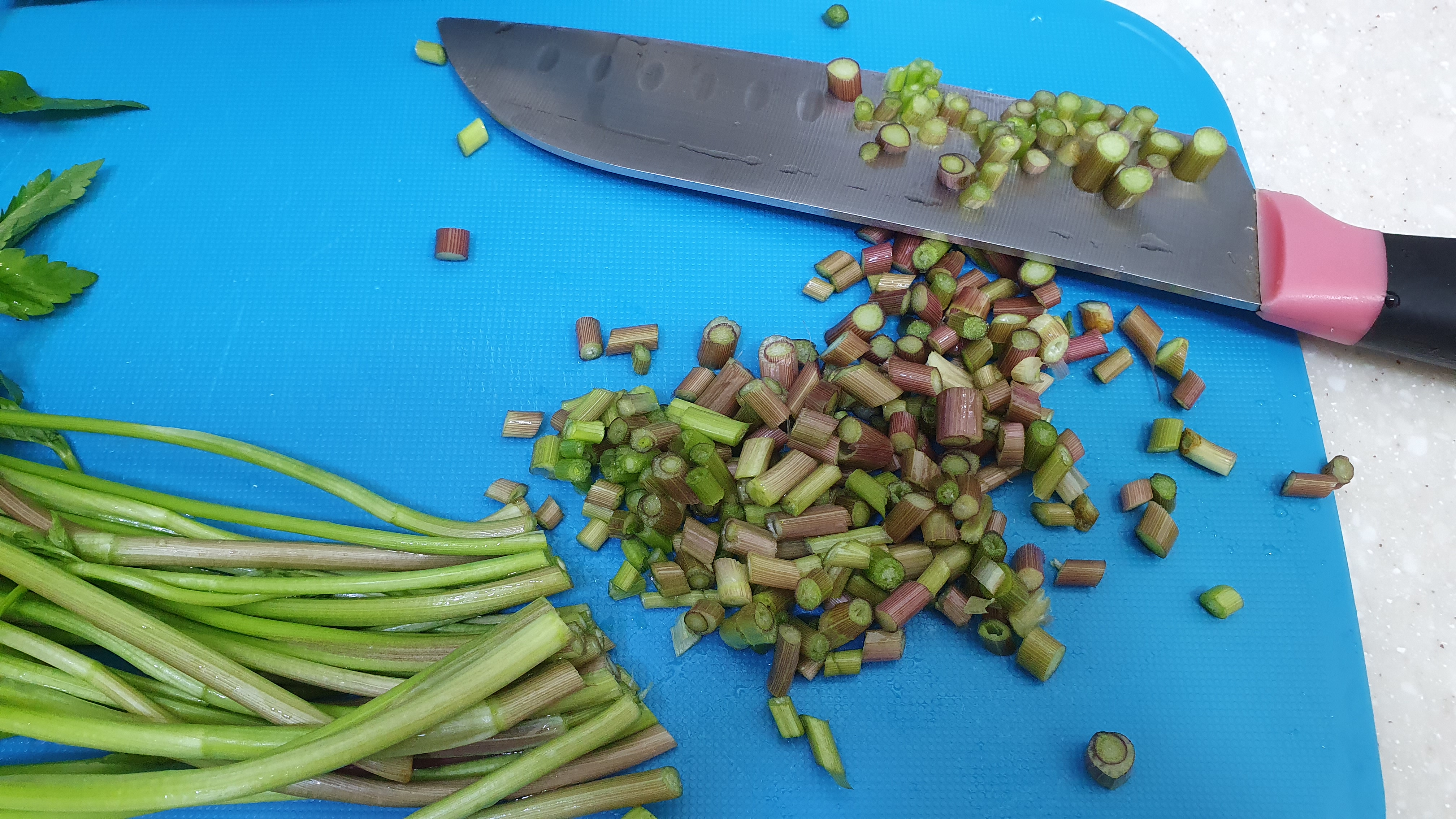 가는 줄기랑 이파리는 어슷 썰어주세요.