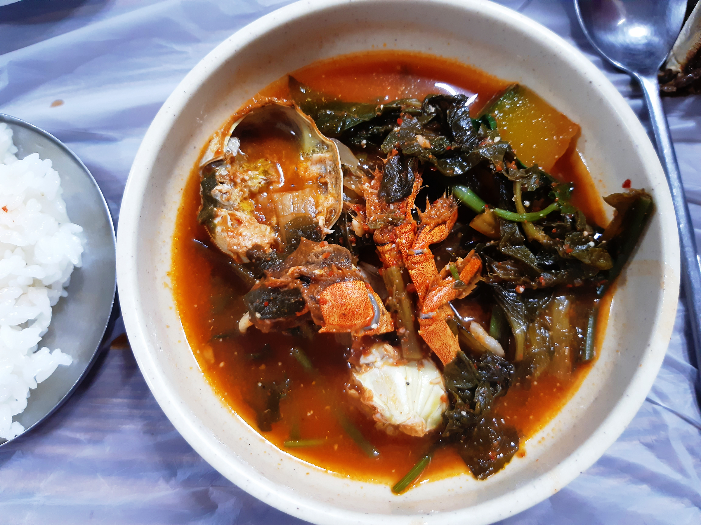 "여기 참게탕 집들은 웬만하면 다 맛있는데요 밖으로 나가서 길 건너면 바로 향미가든 있어예. 거 가 맛도 있고 깔끔해요"