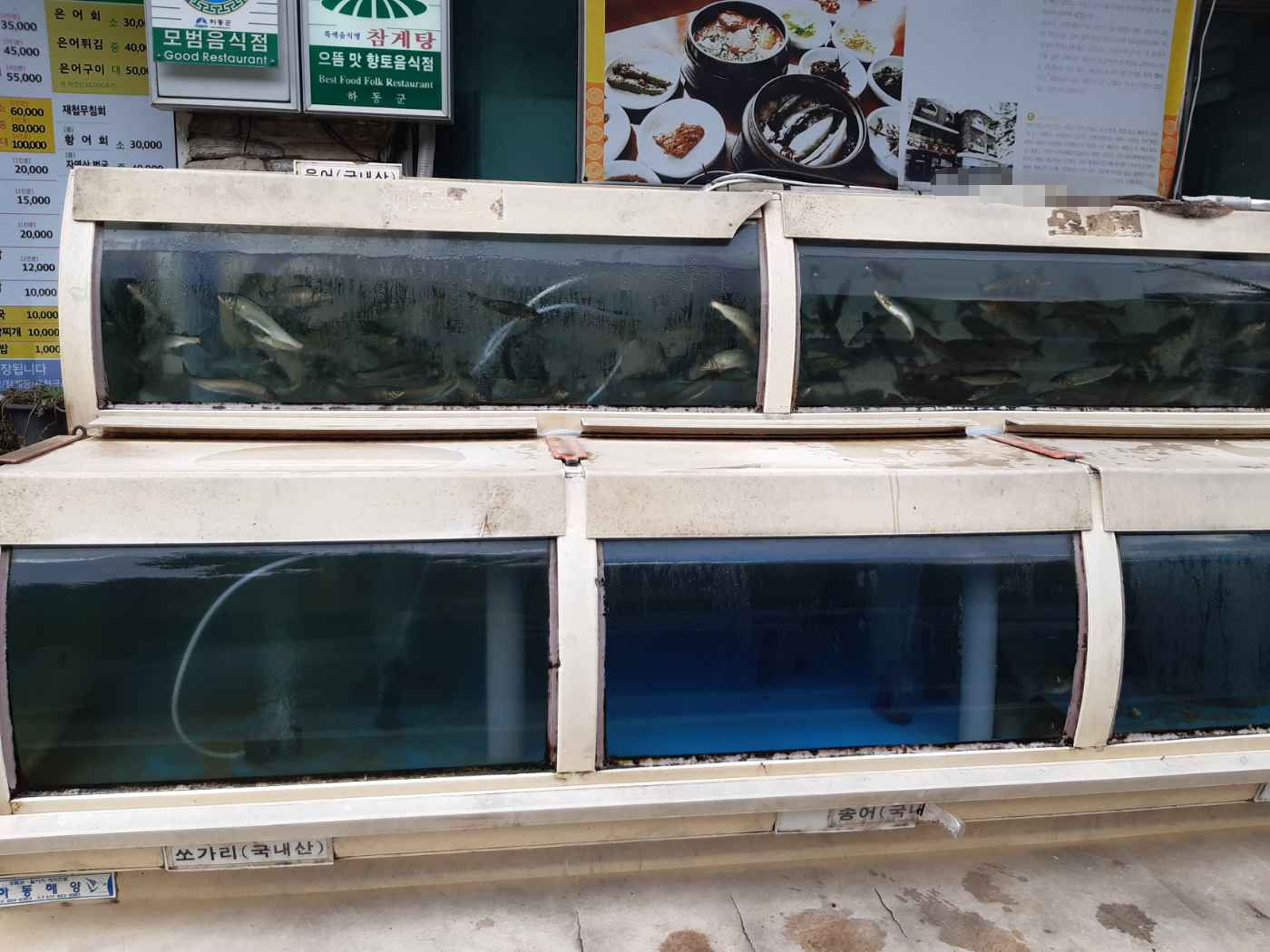 그다지 깨끗하지 않은 수족관에 물고기가 바글바글...